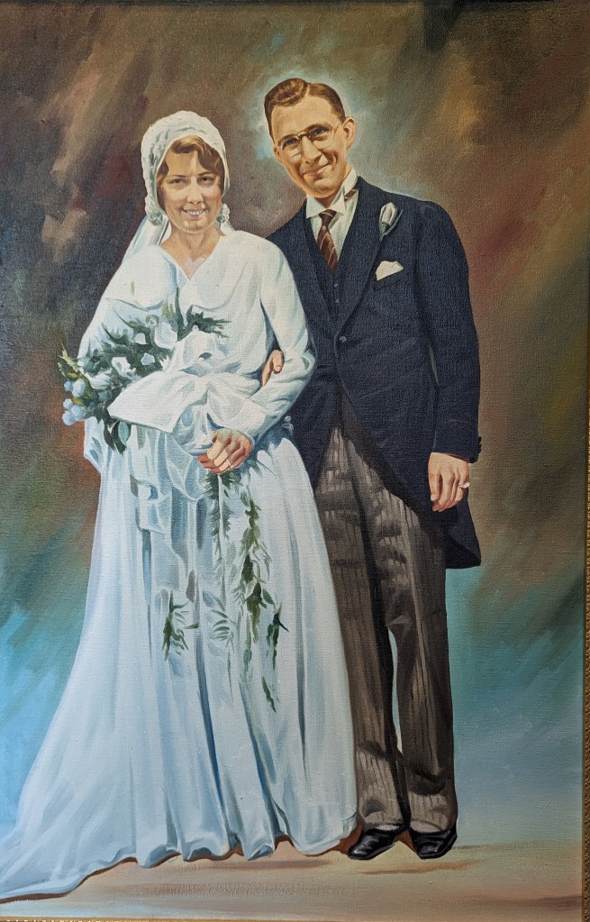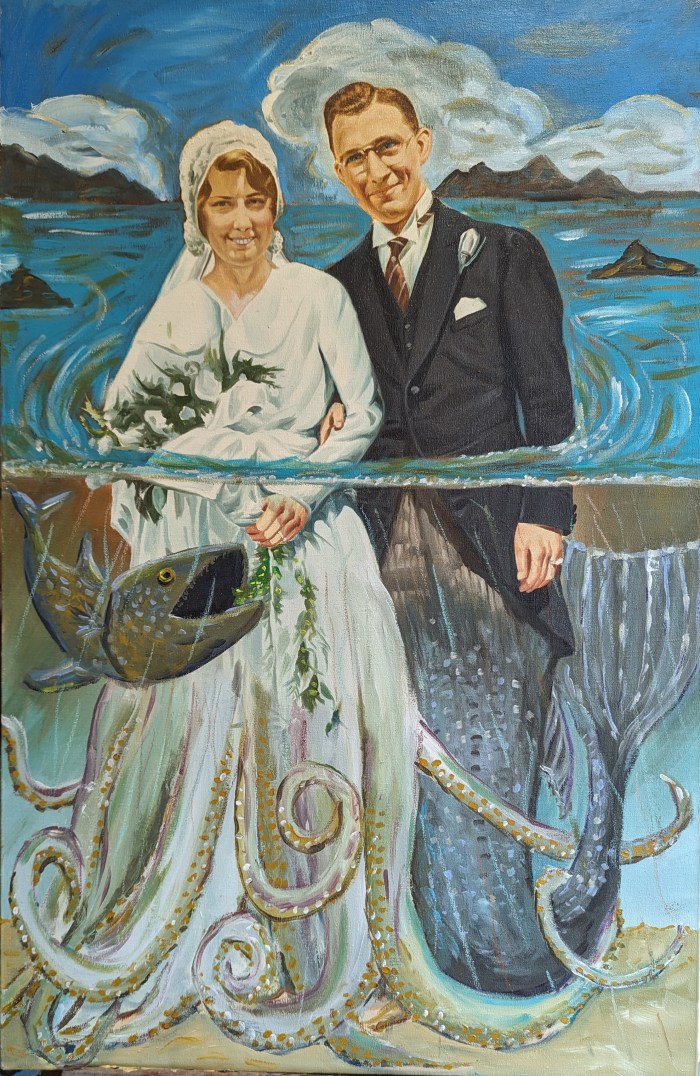 This original painting of a newlywed couple was found under a bed by an estate sale company following the death of the widow. I found the expressions so joyful that I didn’t want to alter their faces in any way. I like this idea of a couple so well suited for each that they function in two different worlds.