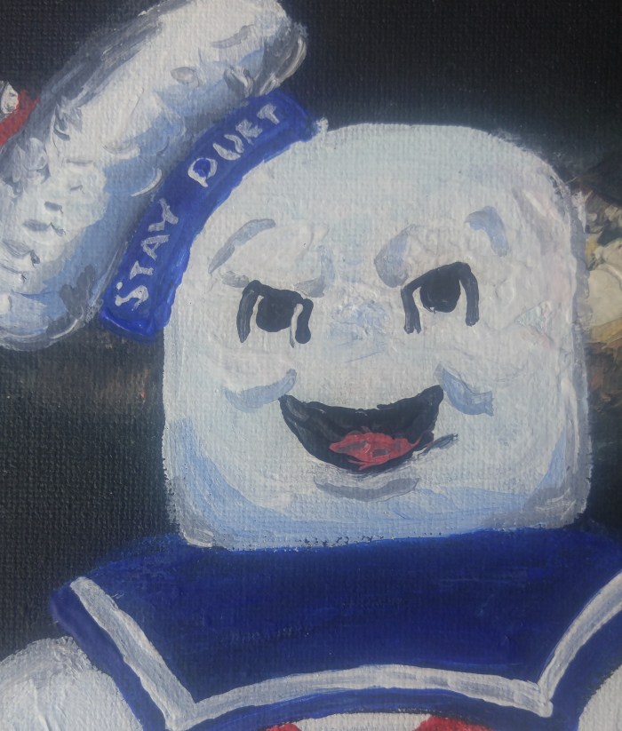 Few characters are easier to paint than the Stay Puft Marshmallow Man from Ghostbusters. The mime can’t scream, of course, and the Parisians can’t be bothered. This is a small painting, so the detail on the mime is atrocious — perhaps I’ll fix it later.