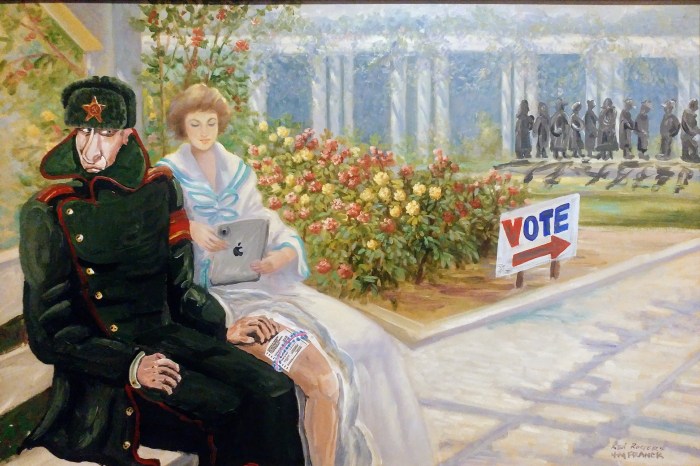 Putin was a natural fit for this piece. As a bonus, the woman looks like a suffragette.