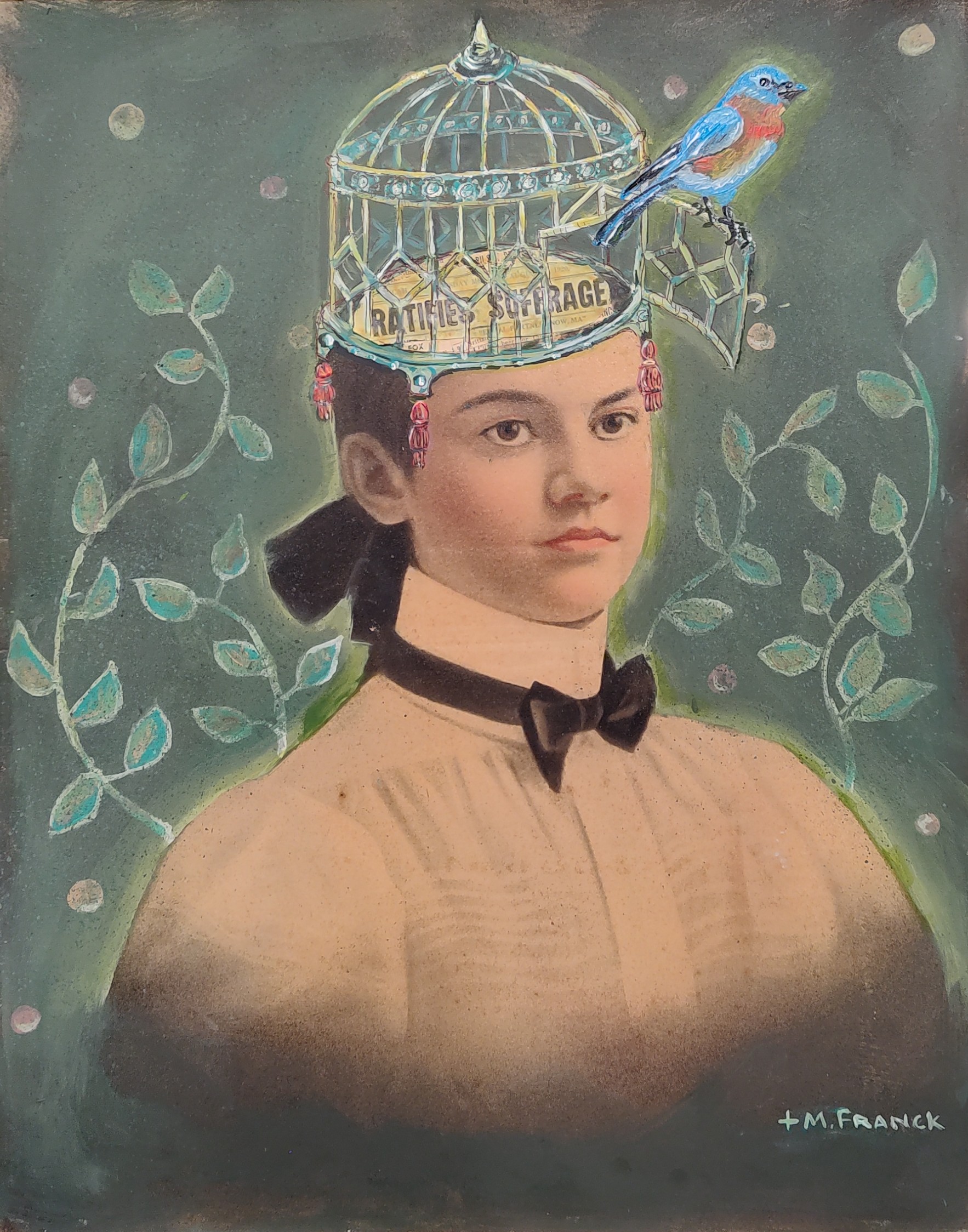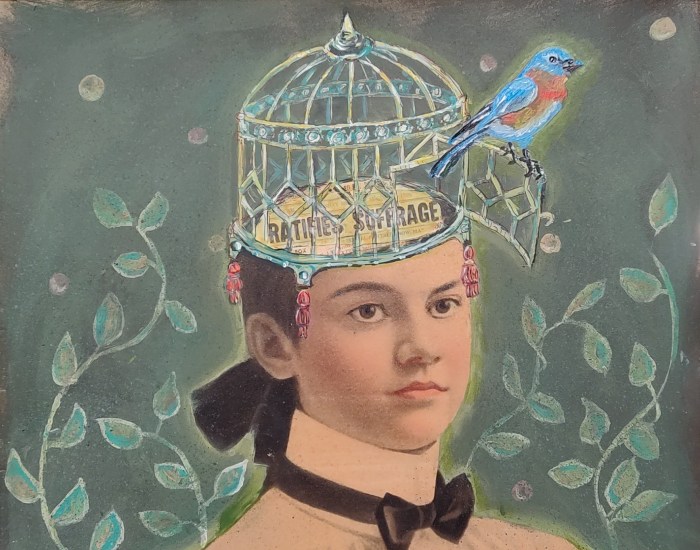 I wasn’t expecting this painting to be about women’s suffrage. I’ve been experimenting in modified portraits for some time. With one, I converted a head to fishbowl. In working through a birdcage concept, I began thinking about a newspaper lining–which sent me to headlines from a century ago.