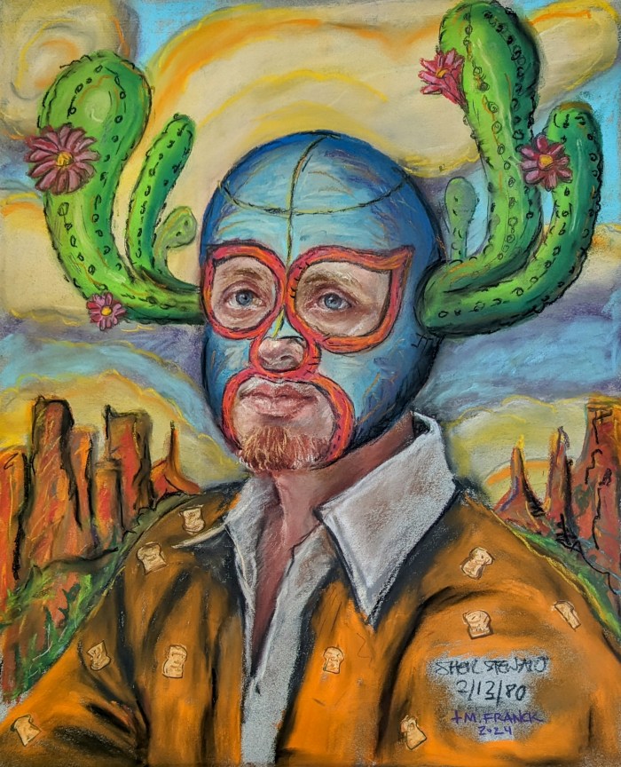 This $2.50 estate portrait offered a good opportunity to try a luchador-based project. Pastels with a few touches of gouache.