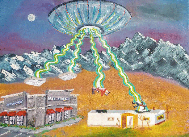When shopping for humans, why not pick up some mattresses. Oddly the original painting already had a mobile home.