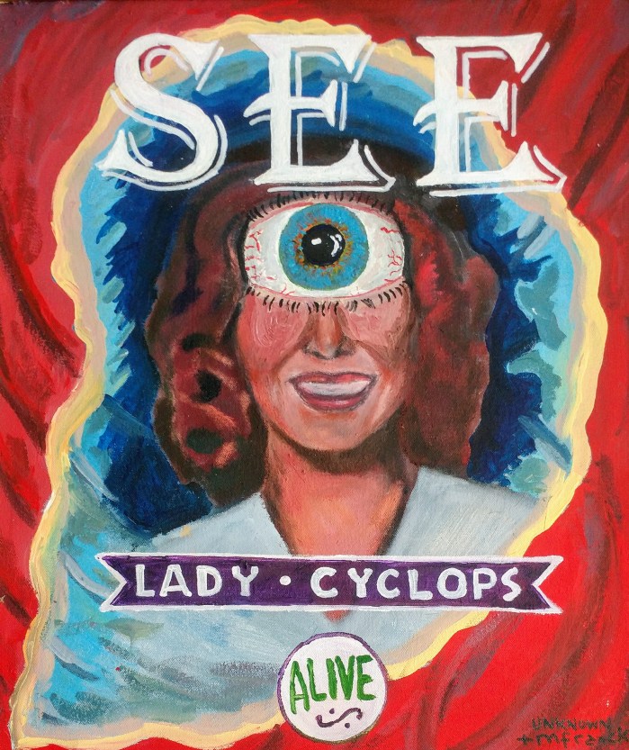 I found a rough portrait of a woman, likely for a school project, at Goodwill for $2. Original landscapes are an easier find. This one seemed right for another carnival poster.