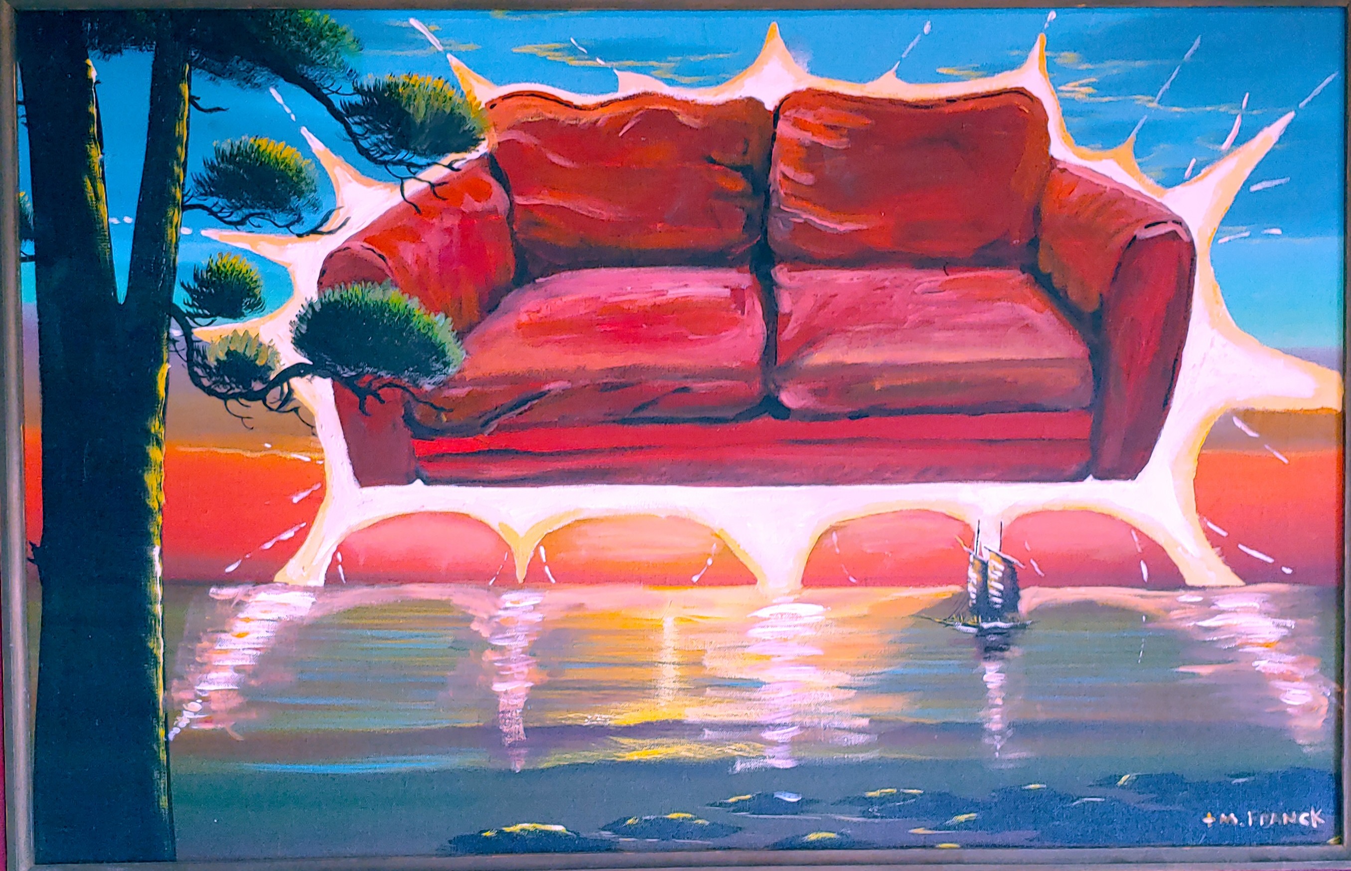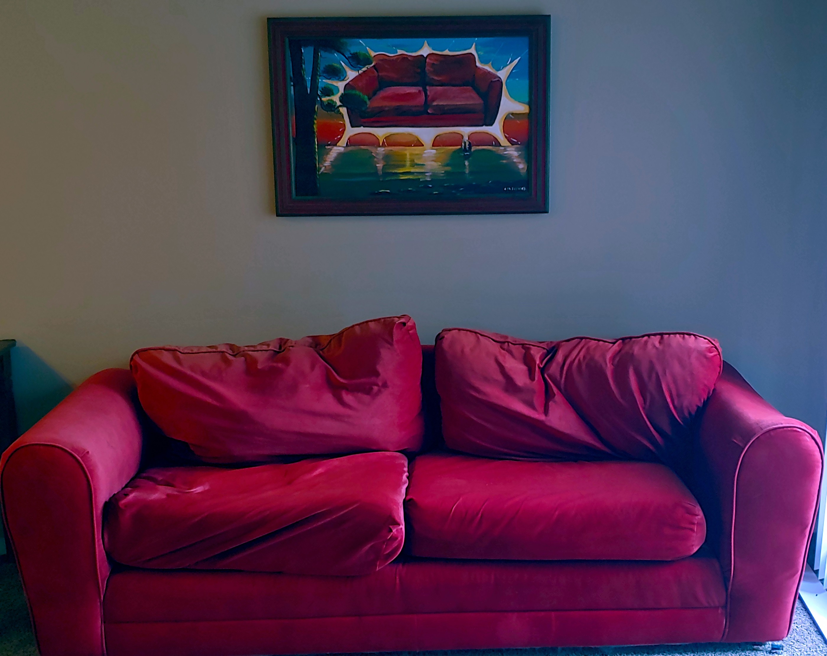 I see a lot of sofa paintings at thrift stores. For this project I contemplated how it might look for the painting to not merely match the sofa, but to also depict it.