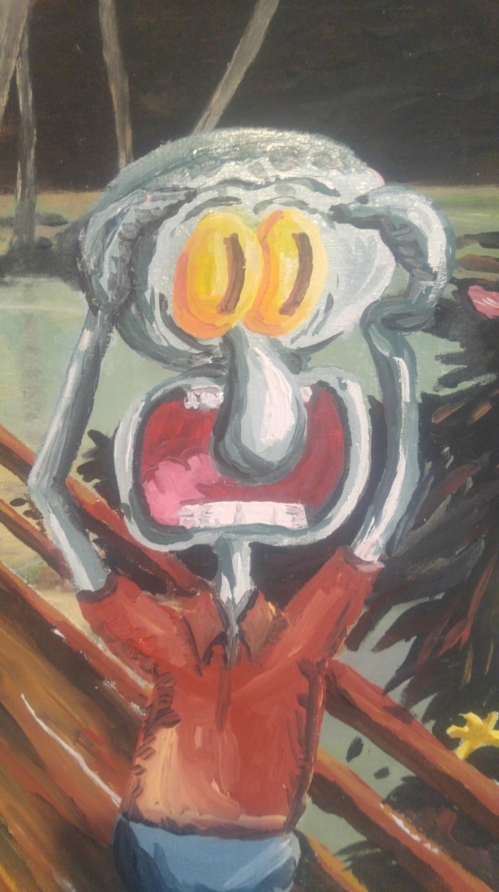 I found what had to be a high school art project depicting what I can only guess is an erupting volcano. The idea of Spongebob came to mind. I’m not the first to use Squidward in ‘The Scream.’ He sort of begs to play the role.