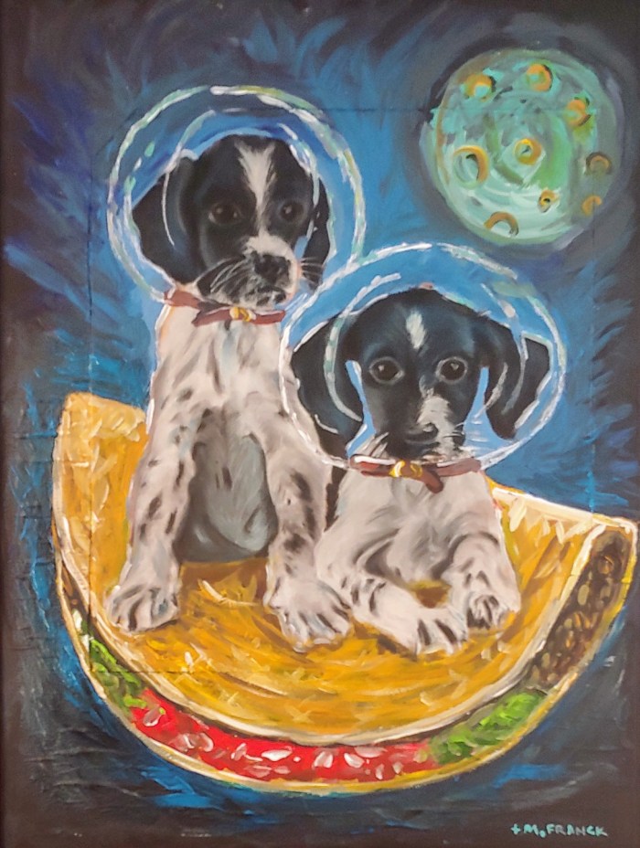 I took this small pastel of sibling puppies and sent them to space on a taco. Why? Because I had previously sent sibling kittens to space on a pizza slice. Both now hang in my kitchen.